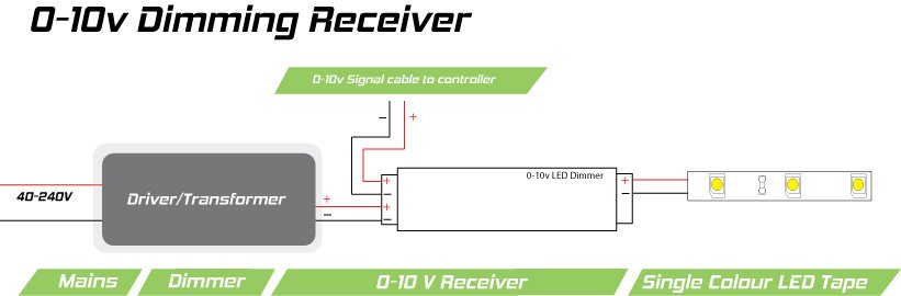 0-10V was initially used and is still being used as a fluorescent dimming system. It is now used as an LED dimming control protocol. At 10V, the system gives 100% lighting output and at 0V the light is usually very dim.