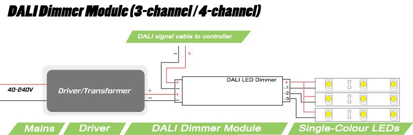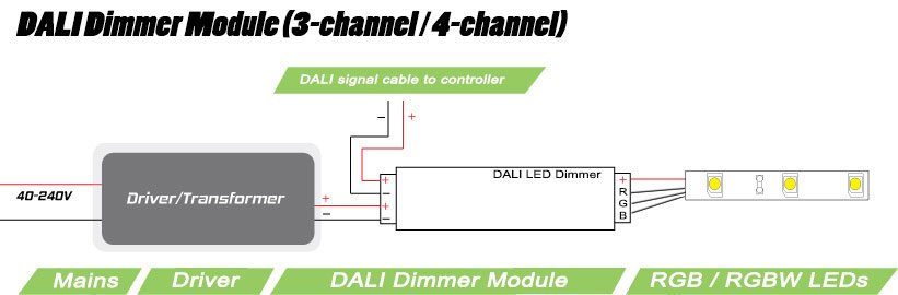 Depending on the number of zones to be independently controlled, you can select either a single-channel (8 amps) or 4-channel DALI receiver (4 x 5 amps). Input voltage is 100-240v AC.