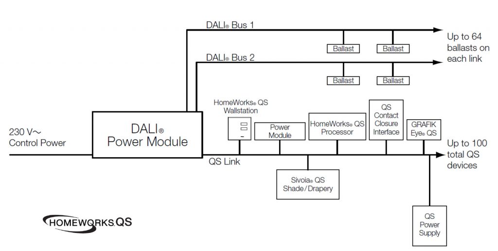 A simple DALI system (sometimes called a loop) can manage a maximum of 64 LED ballasts and power supplies. Each device has its own address, all connected back to the central DALI controller. To manage lighting for a larger location, multiple loops are typically linked and controlled together.