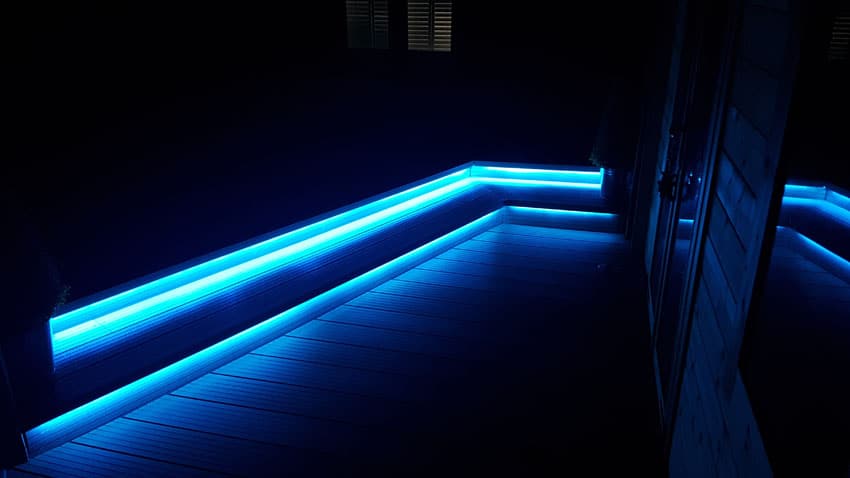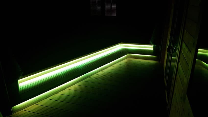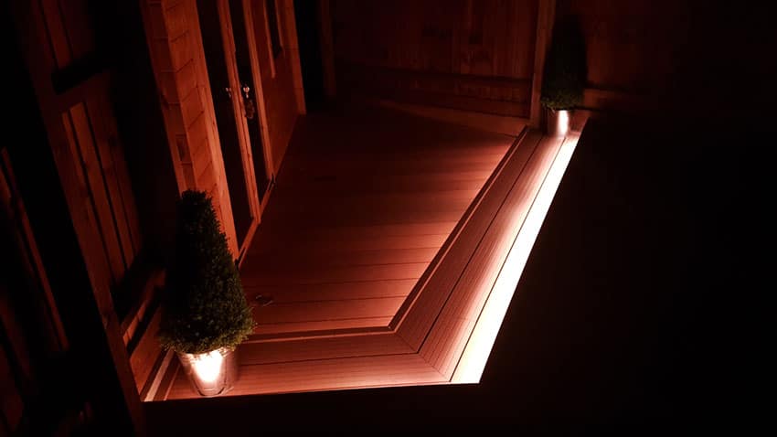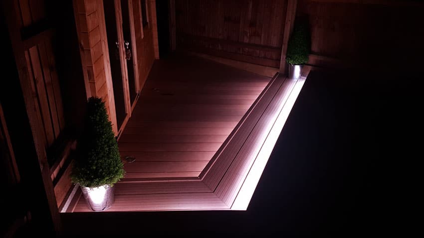Housing a full-size hot tub, the timber cabin is lit inside and out by 8 metres of powerful 20-watt RGBW LED strip lights (4m for the interior, 4m outside). We supplied the LED tape pre-cut and soldered to the exact lengths required for the exterior steps and interior coving, then coated it all in plastic heatshrink with glue-sealed ends to provide IP67-rated waterproofing.