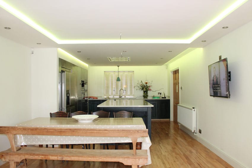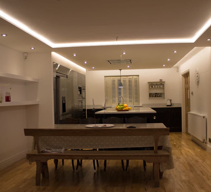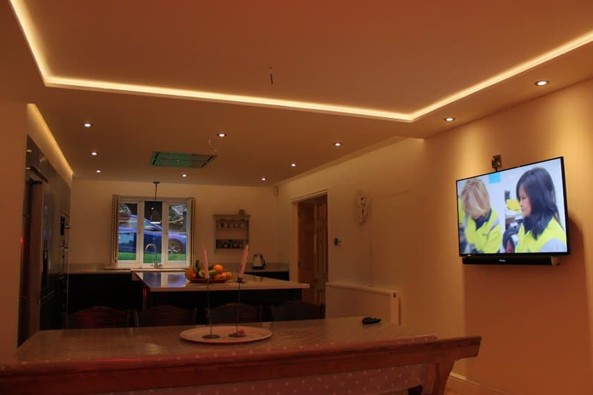 As you can see in the video above, the homeowner has fitted our LED tape as coving lighting, as well as making use of his kitchen’s existing drop ceiling. This makes the colour-changing RGBW strips a perfect complement for the room’s existing LED downlights.