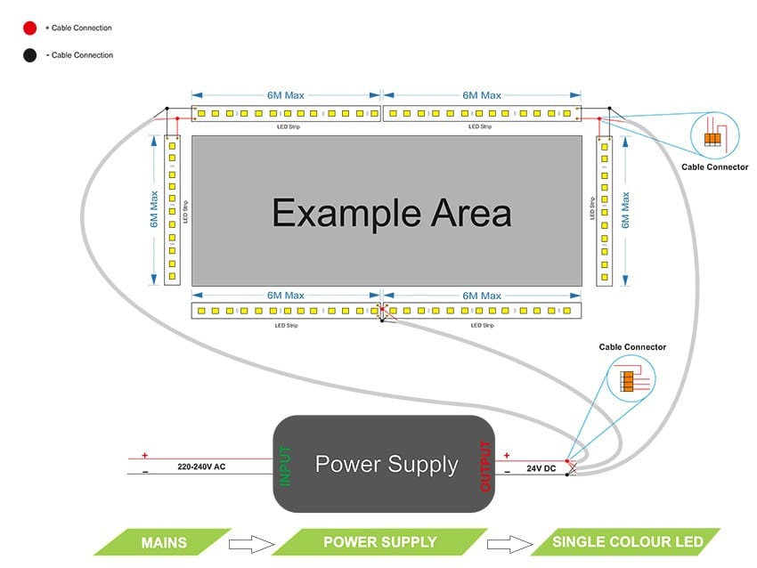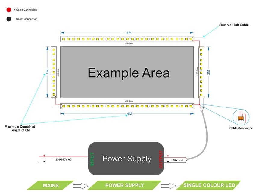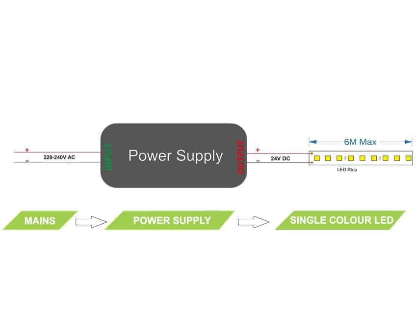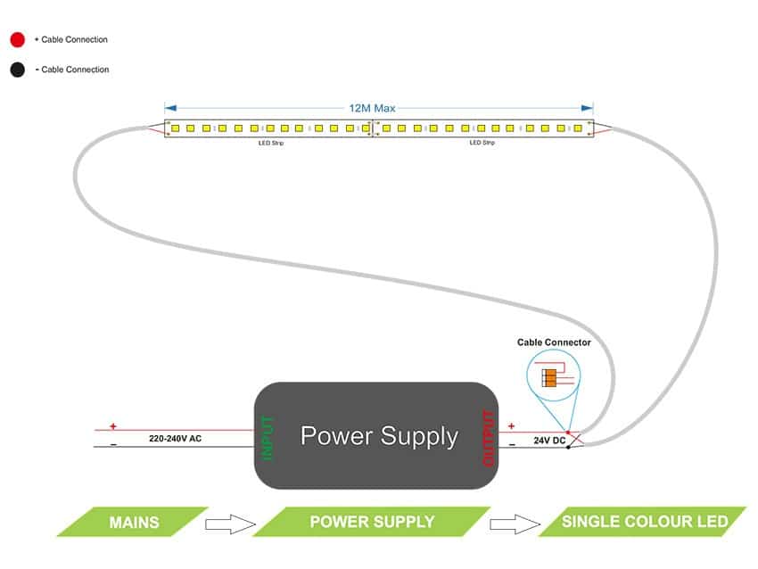 For this type of LED tape you will require just a transformer to get this working. You connect the 2 core starter lead coming out of one end. This is then wired to the transformer, red wire goes to + and the black wire is wired to -. The 2 core cable can be extended as required for you to mount the transformer as far away as required. For more information, choose one of these links for support and advice on how to install either simple or larger LED tape projects.