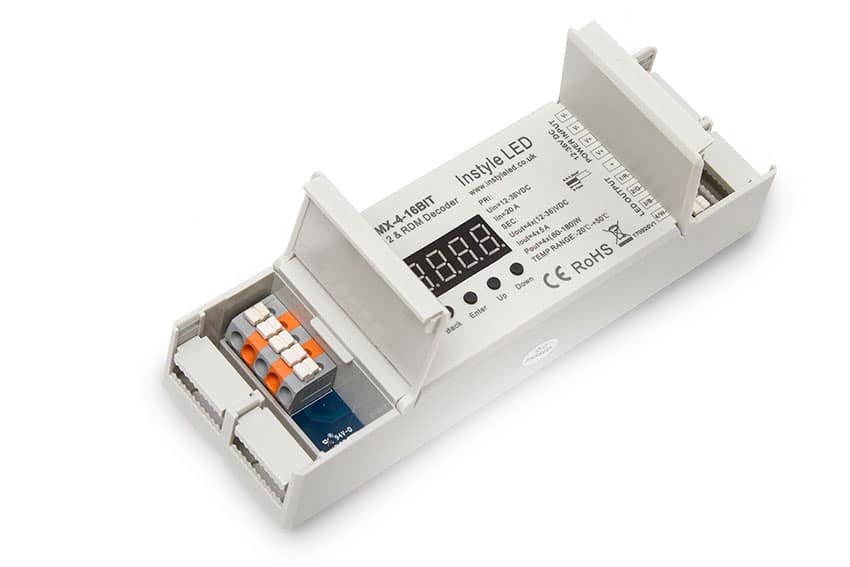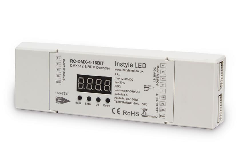 INSTYLE’s 16-bit DMX receiver is a 4-channel decoder that can be linked (through DMX 512 protocol) to any DMX-compatible controller. Read more.