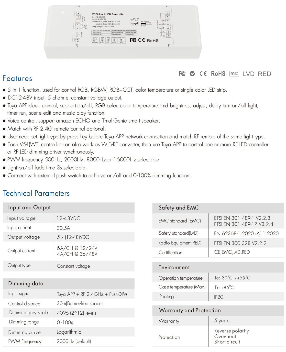 In short, the Smart 5-in-1 Wi-Fi and 2.4GHz Wireless LED Controller is a powerful and versatile lighting control solution that is ideal for a wide range of commercial and residential applications.