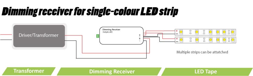 See the ‘dimming receiver for single-colour LED strip’ wiring diagram (fig 5 below) for more detail.