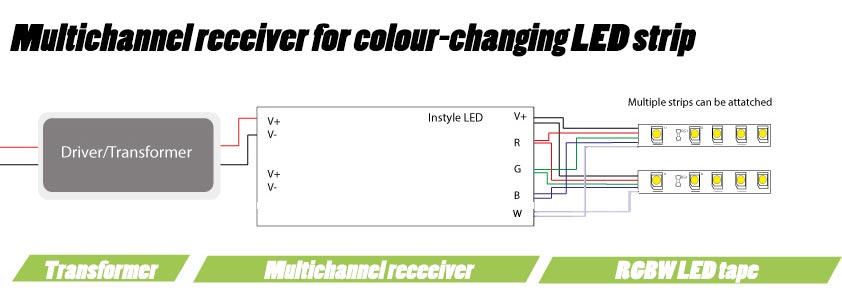 See the ‘multichannel receiver for colour-changing LED strip’ wiring diagram (fig 6) for more detail.
