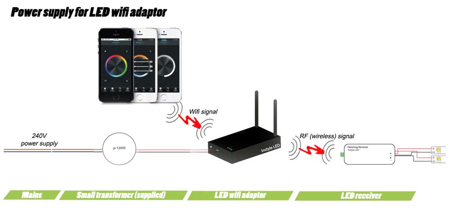 The wifi receiver is powered by a small 9-watt 12-volt transformer (supplied with the product) that is connected directly to your mains supply’s +ve and -ve cables. See the ‘power supply for LED wifi adaptor’ wiring diagram (fig 9) for more detail.