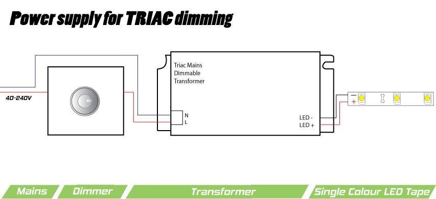 All you have to do is connect your LED tape to the TRIAC transformer’s output (+ve and -ve cables), and its input to a standard household mains dimmer switch. We recommend InStyle’s own TRIAC wall dimmer/remote pack, Aurora’s AU-DSP400X dimmer module or Varilight’s V-Pro series.