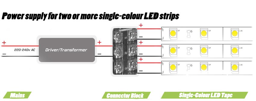 2. How to wire a power supply to drive two or more single-colour LED strips