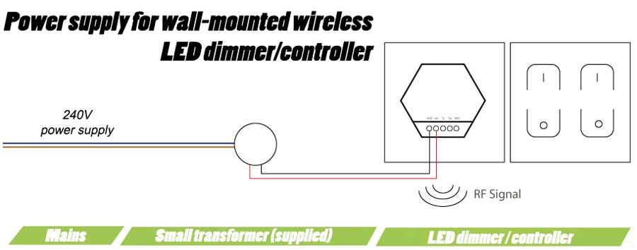 Because they control LEDs via a wireless (RF) signal, wall-mounted wireless dimmer/controllers don’t need to be installed into the circuit that drives your LED strip lights. Most wall controllers are supplied with their own small 9-watt 12-volt transformer, to be wired directly to your mains power supply.