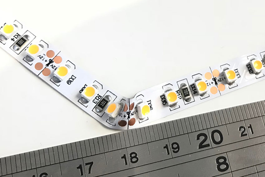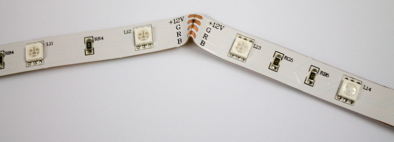 So bending your LED strip lights for installation on a curved surface is very straightforward. But what if your projects needs its LED tape to be bent flat (across the PCB’s edge), as in the picture below?