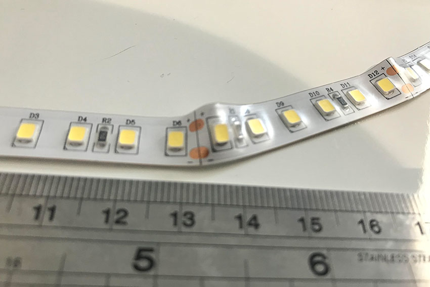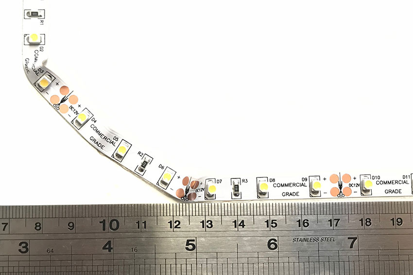 The 5-watt white LED tape shown here has 60 LEDs per metre, mounted on an 8-millimetre-wide PCB.
