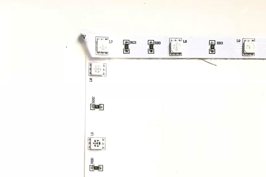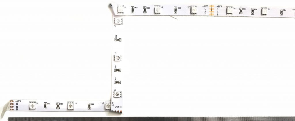 Instead, you should position the LED strip sections close together. The goal is to keep an even amount of space between the LEDs on the boards, like so: