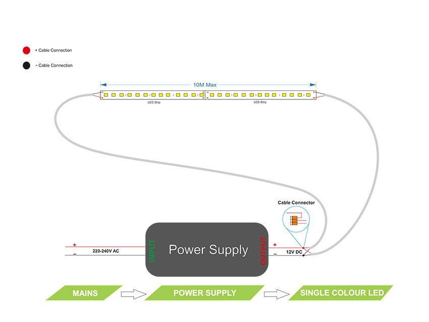 - Wire the LED strip in a ring main (powered both ends), which will drive a run of strip-lighting up to 12m long,