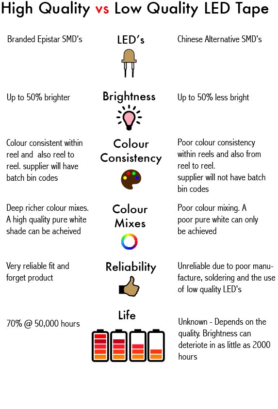 - Brighter LEDs – Epistar’s 3528 and 5050 SMDs are among the brightest like-for-like LED tape SMDs you will find. Output is typically 30% – 50% brighter than cheaper Chinese alternatives.